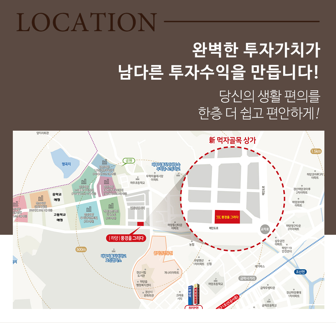 안정적인 투자 수익성 확보 하양지구 초입 대도로변 최고입지 상업시설의희소성과 차별화 및 고급화 |